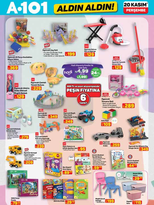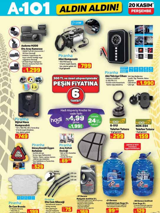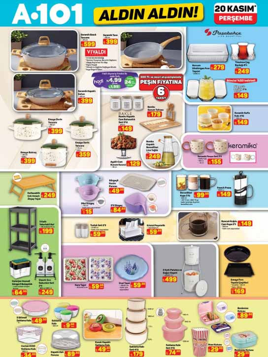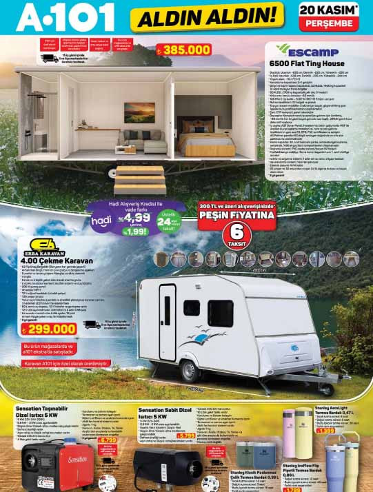 A101 afişi ile Aldın Aldın kataloğu bu hafta ürünleri yayınlandı. 20 Kasım 2025 A101 aktüel kataloğu ürünleri, her hafta olduğu gibi bu Perşembe günü raflarda yerini alacak. A101 indirim broşürü içerisinde; 6500 flat tiny house 385.000 TL, 4.00 çekme karavan 299.000 TL, Stanley Aerolight termos bardak 0,47 L 1.399 TL, Stanley Klasik Paslanmaz Çelik Termos Bardak 0,35 L 1.199 TL, Stanley IceFlow Flip Pipetli Termos Bardak 0,89 L 1,799 TL, taşınabilir dizel ısıtıcı 5 KW 6.799 TL, sabit dizel ısıtıcı 5 KW 5.799 TL, 88 tuşlu piyano 10.899 TL, halı ve koltuk yıkama makinesi 3.799 TL, oto araç kamerası 1.299 TL, mini kompresör 799 TL, akü takviye cihazı 1.990 TL, dijital hava kompresörü 749 TL, G-512 telefon tutucu 299 TL, katlanabilir çok amaçlı ahşap tepsi 249 TL, emaye fırın tepsisi çeşitleri 169 TL ile müşterilerin beğenisine sunulacak. Çeşitli ihtiyaçlara yönelik birçok ürün A101 marketlerde bu Perşembe günü raflardan sepete eklenecek. Peki A101 Aldın Aldın aktüel kataloğu bu hafta nele