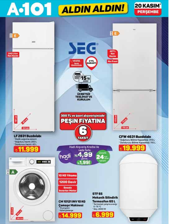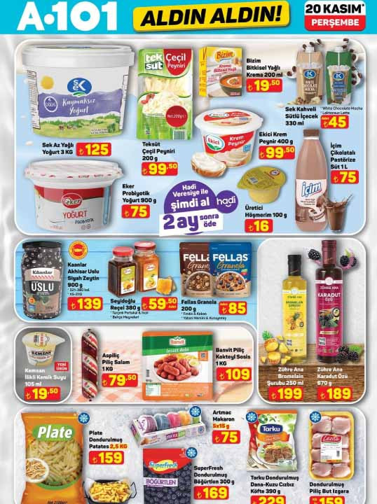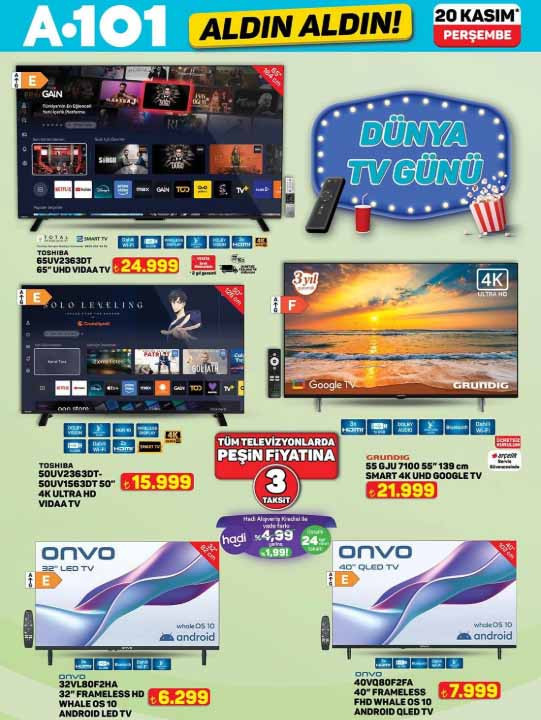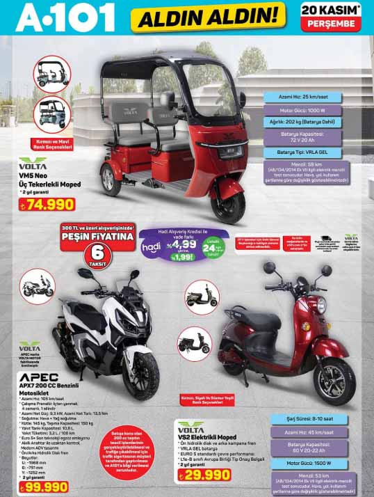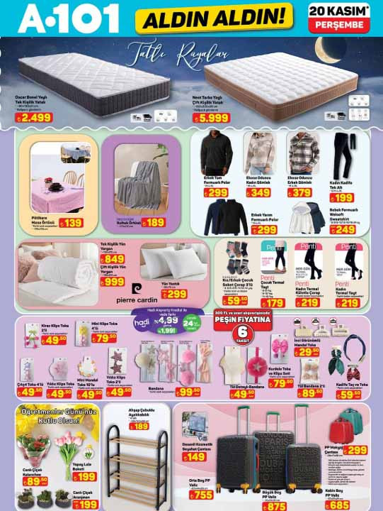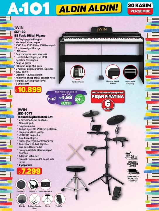 A101 aktüel kataloğu ile yeni ürünleri raflara gelmeye hazırlanıyor. 20 Kasım 2025 A101 afişi tam liste ürünler Perşembe günü raflarda hazır olacak. A101 Aldın Aldın broşürü ile tabureli dijital bateri seti 7.299 TL, 65″ UHD Vıdaa TV 24.999 TL, 32″ frameless UHD Whale OS 10 Android LED tv 6.299 TL, 128 GB cep telefonu 5.299 TL, mekanik silindirik termosifon 65 L 6.999 TL, cam kettle 699 TL, dijital çay makinesi 1.799 TL, 5 in 1 saç şekillendirici set 1.599 TL, 4 başlıklı masaj aleti 799 TL, VM5 Neo üç tekerlekli moped 74.990 TL, güneş enerjili üçgen reflektör 529 TL, araç koltuk desteği 69,50 TL, oto cam sileceği 75 TL, -37 derece radyatör antifrizi 3L 169 TL, emaye derin tencere 399 TL, kristal peçetelik 59,50 TL, çocuk termal tayt 179 TL, kadın termal tayt 219 TL, çift kişilik yün yorgan 999 TL, yün yastık 299 TL, orta boy PP valiz 755 TL, desenli kozmetik seyahat çantası 149 TL ile satışa hazır olacak. Bu hafta yine çeşit çeşit ürün A101 marketlerde alışveriş severleri bekleyecek. Peki A101 indirim kataloğunda neler var? İşte tam liste 20 Kasım 2025 A101 Aldın Aldın ürünleri…