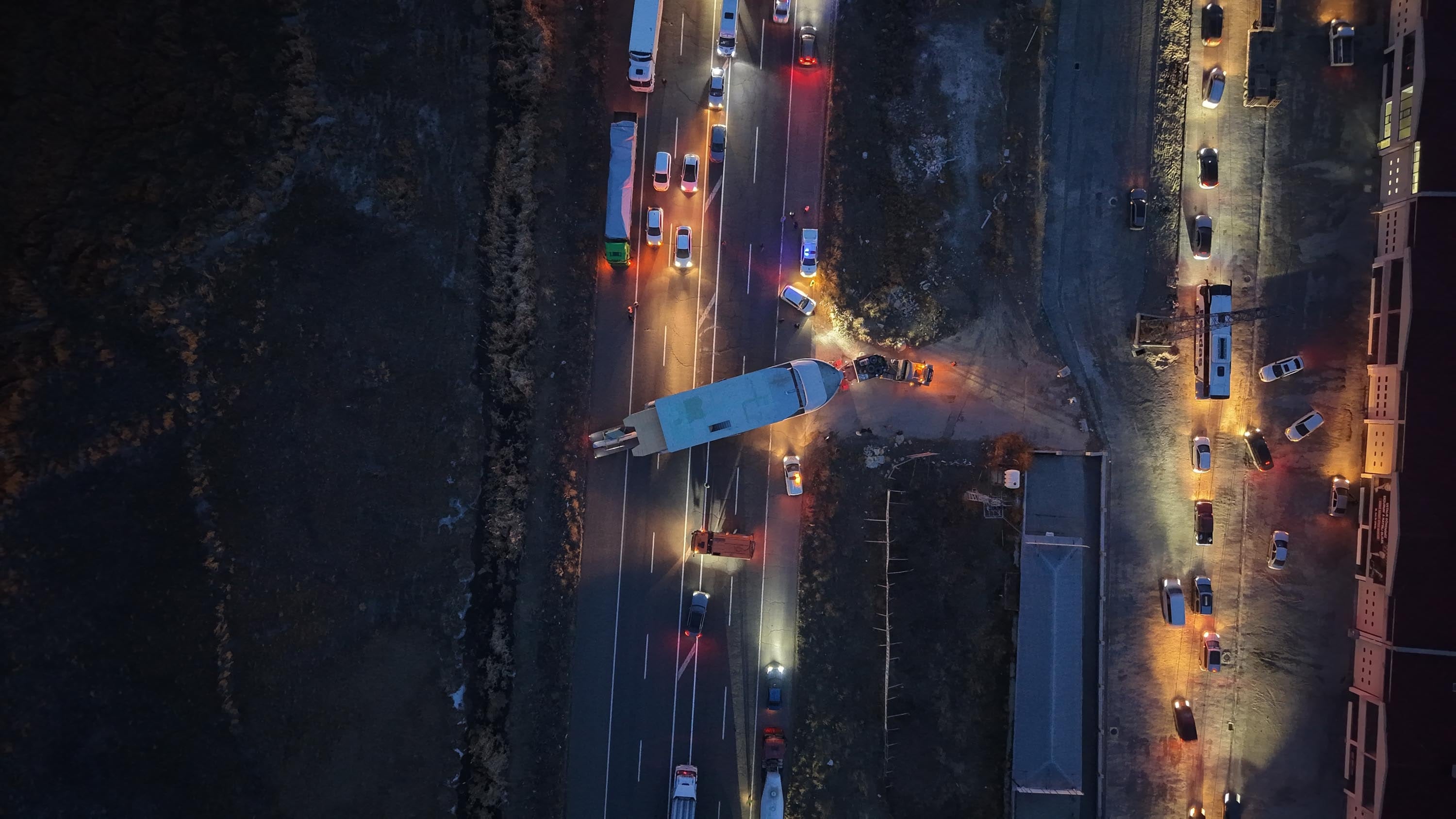 Tırın çift şeritli yolu kapatması nedeniyle ihbar üzerine bölgeye jandarma, trafik polisleri ile karayolları ekipleri sevk edildi.