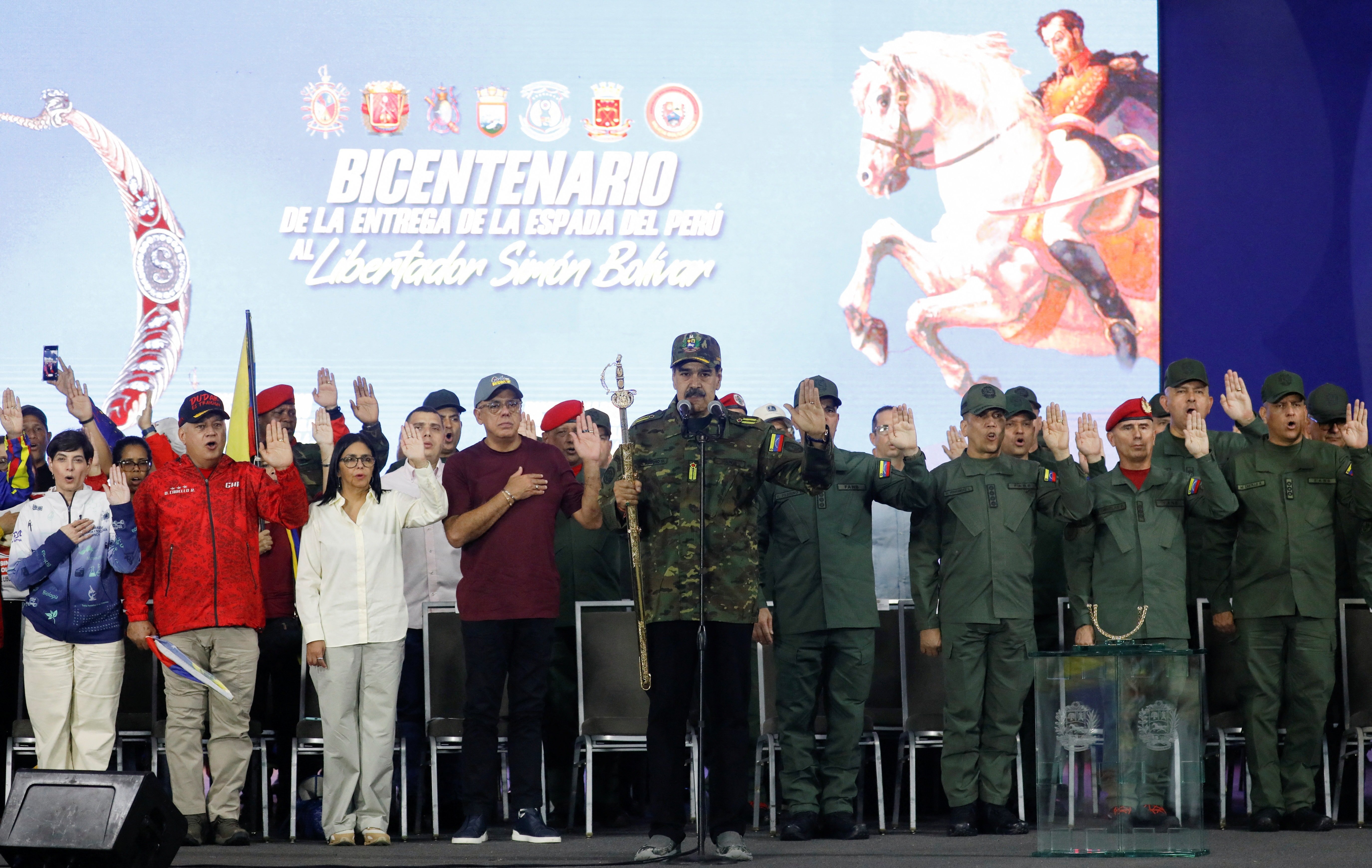 Bugün halkının huzuruna kamuflajlar giymiş olarak çıkan Maduro, “Bolivar’ın kılıcını” kuşandı.