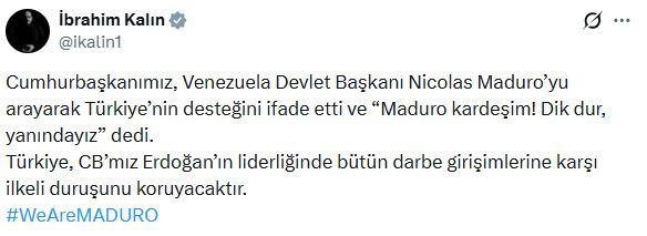 Maduro, X’te (o dönemki ismi Twitter) yaptığı paylaşımda, “Rusya, Çin, Türkiye ve diğer hükümetlere ve dünya halklarına, Venezuela’nın meşru olarak kurulmuş hükümetine verdikleri güçlü destek için teşekkür ediyorum” dedi ve ekledi: “Venezuela yalnız değil!”